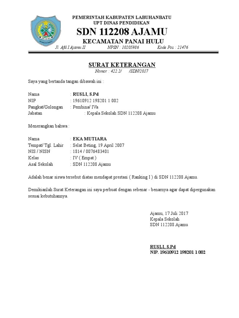 Contoh surat keterangan berprestasi smp.